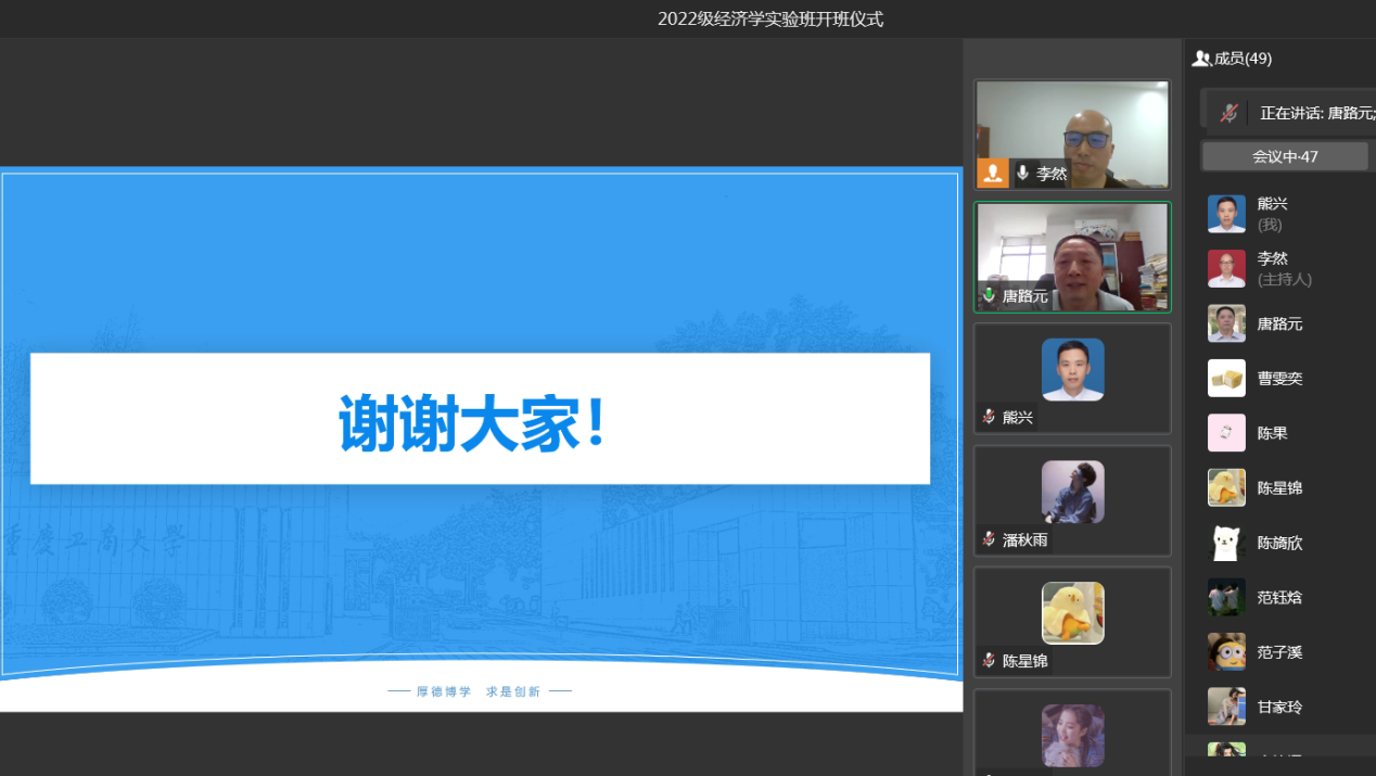 2022级经济学实验班开班仪式于2022年9月9日上午10:15在企业微信平台上进行,公司党委书记李自维、副经理尹元福、应用经济系主任李然和副主任田庆刚、政治经济系主任林黎、相关教师代表及2022级经济学实验班全体新生参加了此次活动。活动共分为六项议程:尹元福副经理代表院领导班子致辞、系主任介绍实验班具体情况、教师代表唐路元教授发言、班导师熊兴老师发言、2020级经济学实验班代慧玲同学发言、2022级经济学实验班刘诗雨同学发言。