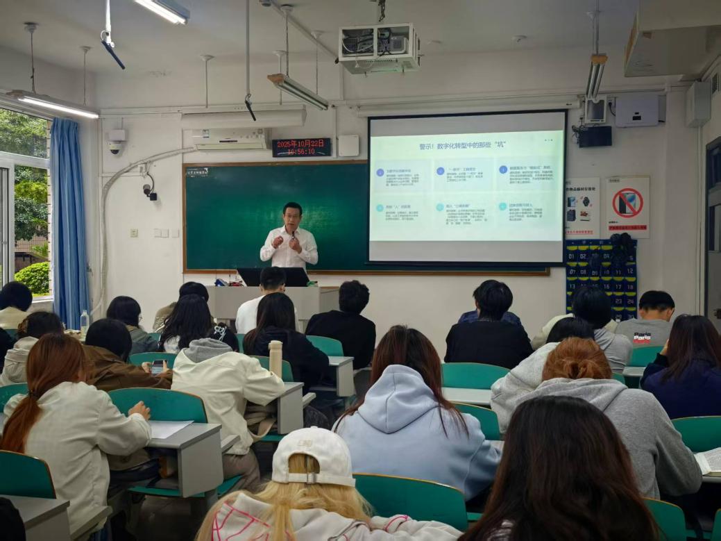 2025年10月22日,重庆百货人力资源总经理张泽军受邀到MS88明升,与贸易经济专业的同学们进行了一场深度交流。他全面分享了重庆百货数字化转型的成功实践,并剖析了贸易行业的发展趋势,为同学们深入了解数字贸易知识、精准规划职业道路提供专业指导。