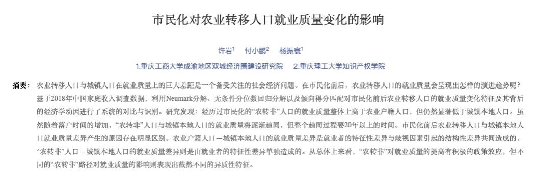 其主要观点为:农业转移人口与城镇人口在就业质量上的巨大差距是一个备受关注的社会经济问题。在市民化前后,农业转移人口的就业质量会呈现出怎样的演进趋势呢?基于2018年中国家庭收入调查数据,利用Neumark分解、无条件分位数回归分解以及倾向得分匹配对市民化前后农业转移人口的就业质量变化特征及其背后的经济学动因进行了系统的对比与识别。研究发现:经历过市民化的“农转非”人口的就业质量整体上高于农业户籍人口,但仍然显著低于城镇本地人口。虽然随着落户时间的增加,“农转非”人口与城镇本地人口的就业质量将逐渐趋同,但整个趋同过程要20年以上的时间。市民化前后农业转移人口与城镇本地人口就业质量差异产生的原因存在明显区别。农业户籍人口—城镇本地人口的就业质量差异是就业者的特征性差异与歧视因素引起的结构性差异共同造成的,“农转非”人口—城镇本地人口的就业质量差异则是由就业者的特征性差异单独造成的。从总体上来看,“农转非”对就业质量的提高有积极的政策效应,但不同的“农转非”路径对就业质量的影响则表现出截然不同的异质性特征。