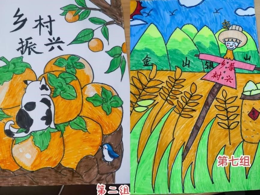设计结束后,各组代表依次上台分享本组的选品理由和设计思路。其中第二小组代表在分享时介绍到,其作品以柿子作为创作主题,寓意事事如意,同时也通过对于丰收的描绘来表达对乡村振兴的美好愿景;第七小组的海报则以大山为背景,辅以稻穗和稻草人,向同学们传递绿水青山就是金山银山的理念。