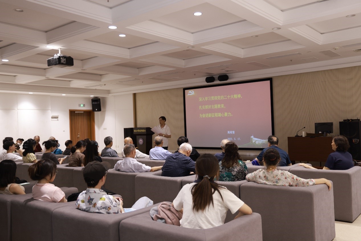 首先,周希贤教授从“时代”“使命”和“抓手”三个关键词出发,带领参会党员同志学习习近平新时代中国特色社会主义思想主题教育的重大意义和党的二十大精神相关内容。周教授强调学习贯彻习近平新时代中国特色社会主义思想是党的二十大提出的重要任务,是一件事关全局的大事,是把党的二十大擎画的宏伟蓝图变为现实的有力举措。围绕党的二十大报告,他带领大家先后学习党的二十大的主题、主要成果、奋进新征程的历史使命、新时代十年伟大变革的成就和里程碑意义、全面建设社会主义现代化国家的目标任务、坚持习近平新时代中国特色社会主义思想为指导等内容,最后从中国式现代化的中国特色、中国式现代化的本质要求以及推进中国式现代化建设的重大原则三方面讲解如何以中国式现代化建设社会主义强国、推进中华民族伟大复兴。