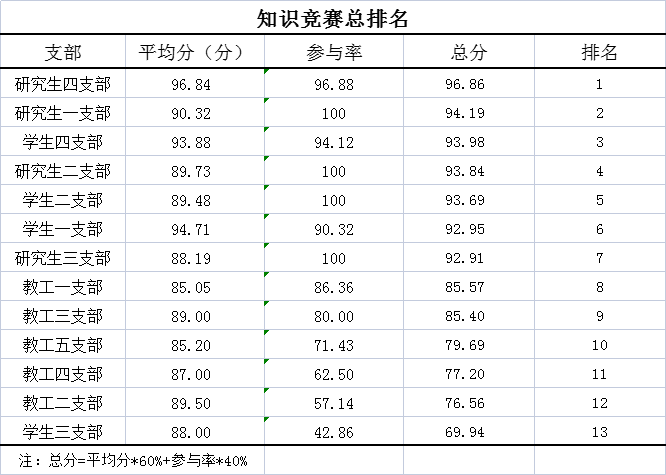 本次知识竞赛采取线上限时答题的形式,每名参赛选手限时25分钟内完成50道题目,题目以习近平新时代中国特色社会主义思想为主要依据和核心主线,内容涵盖党的二十大报告、党章、《习近平经济思想学习纲要》、《习近平新时代中国特色社会主义思想专题摘编》等,设置单选、多选及判断等多种题型,形式多样,内容丰富。在各党支部的积极组织下,本次知识竞赛共有274名师生党员参加。根据各支部竞赛成绩平均分和支部党员参与率进行综合评比,研究生四支部获得一等奖,研究生一支部、员工四支部获得二等奖,研究生二支部、员工二支部、员工一支部获得三等奖。