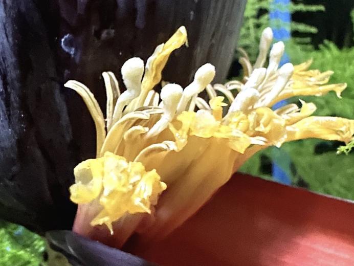 芭蕉为芭蕉科芭蕉属多年生草本植物,植株可长至2.5-4米,株型粗壮挺拔,辨识度极高。叶片呈长圆形,长2-3米、宽25-30厘米,叶面鲜绿光亮,舒展大气;花序顶生且自然下垂,苞片呈红褐色或紫色,雄花生于花序上部,雌花在每一苞片内成列生长,每列约10-16朵。